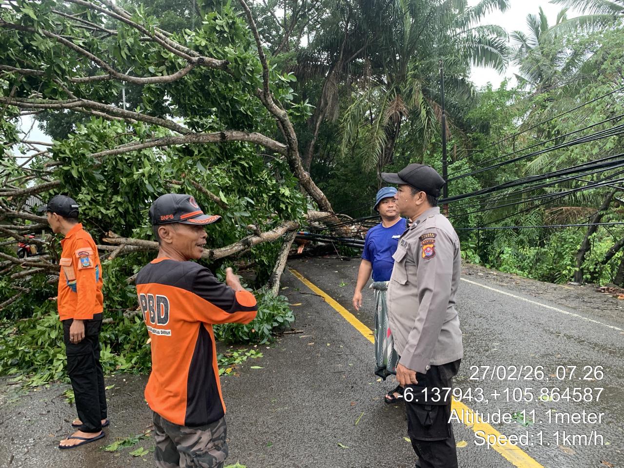 *Polres Cilegon* - di Jalan Raya Cinangka-Anyer tepatnya di Kp. Lebak Sawo Ds. Sindanglaya Kec. Cinangka Kab. Serang telah terjadi pohon tumbang yang disebabkan oleh Angin dan Pohon yang sudah berumur tua, Jumat (27/022026).