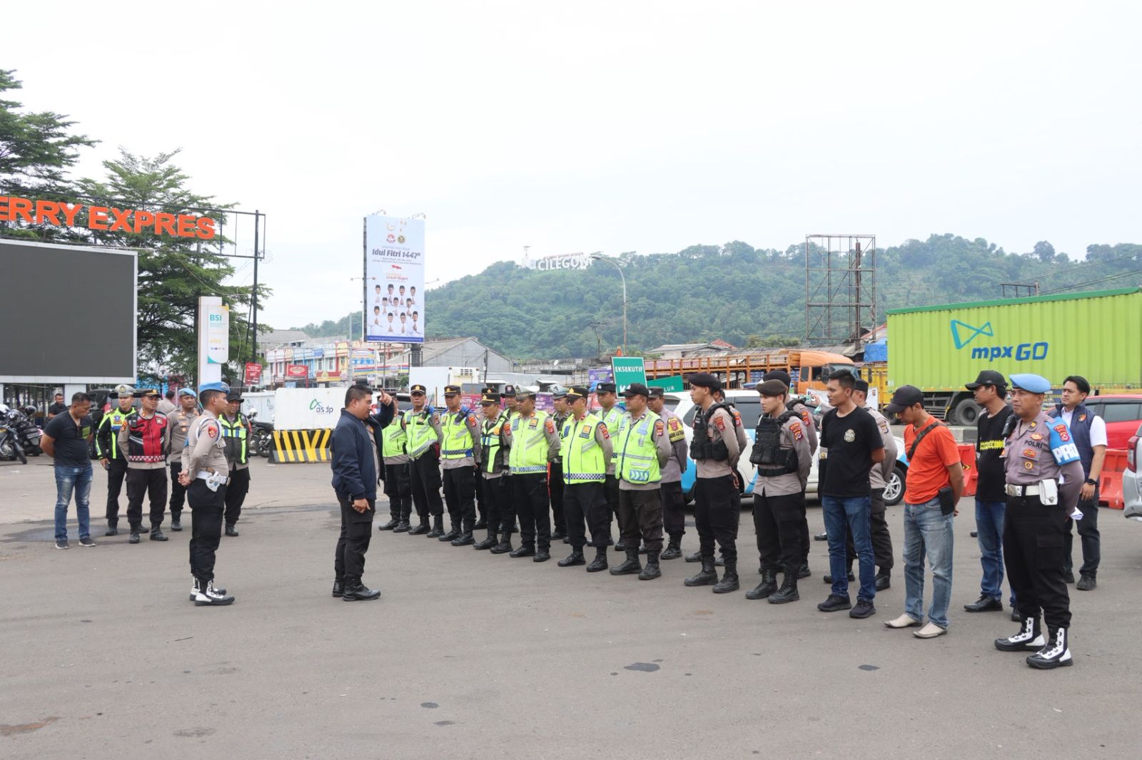 Kapolres Cilegon Polda Banten AKBP Dr. Martua Raja Taripar Laut Silitonga, S.H., S.I.K., M.Si. memimpin langsung kegiatan monitoring situasi di lapangan guna memastikan arus kendaraan tetap berjalan lancar.